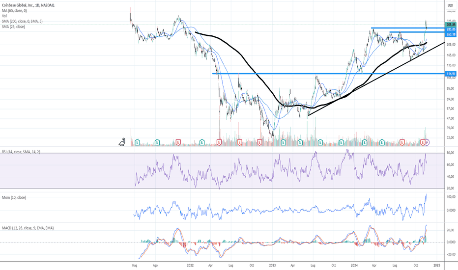 Coinbase sopra 200 dollari è un affare?Coinbase recupera nel mese di Maggio la quotazione di 200 dollari e attualmente sembra esserci un buon momentum trainato anche dal Bitcoin sopra i 100k.