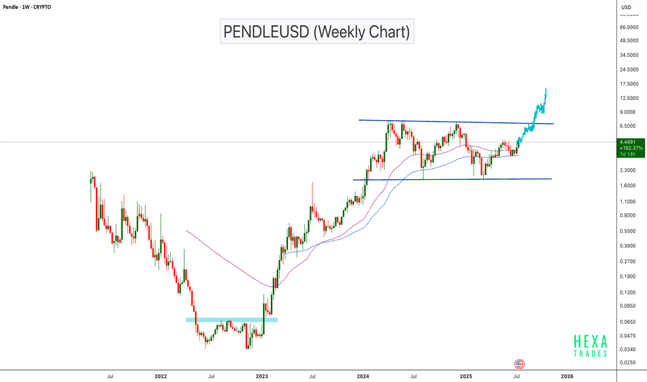 PENDLEUSD Bullish Continuation Setup!BINANCE:PENDLEUSDT has surged approximately 20,000% from its bottom, showing exceptional long-term strength. The price is now approaching a major horizontal resistance zone on the weekly chart. If the price breaks the parallel channel resistance, we can expect a bullish continuation with a psycholo