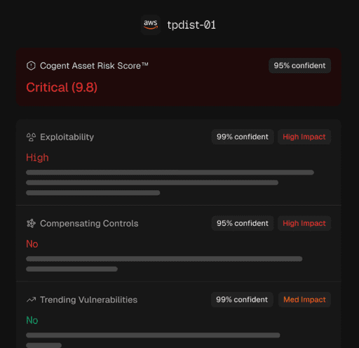 Generic severity scores create friction between security and engineering. Cogent shows you the exact factors that drove each priority so teams understand the reasoning and trust the recommendations.