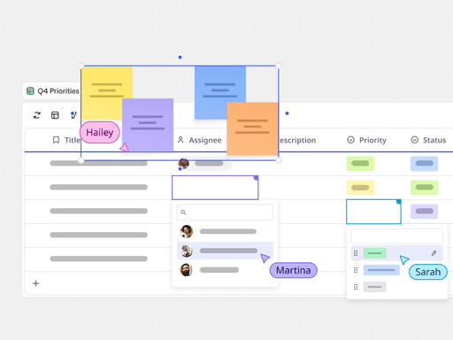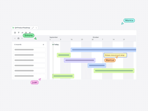 Deja atrás las notas adhesivas y organiza la información con tablas y cronogramas: una fuente de información estructurada ideal para roadmaps, planes de proyectos y objetivos de los equipos.