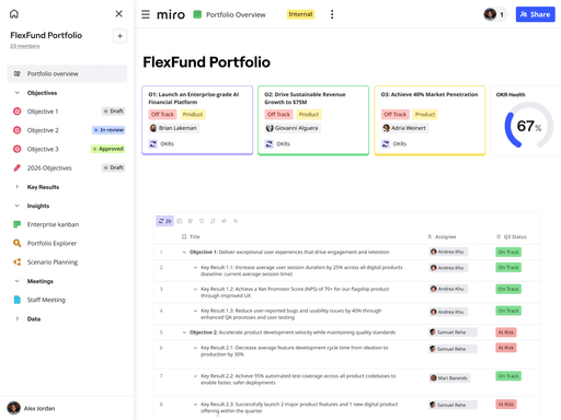 Parhaat digitaaliset työkalut ovat niitä, joita tiimit haluavat käyttää. Miro yhdistää visuaalisen yhteistyön jäsenneltyyn toteutukseen. Pidä innovaatiot elossa ja auta kaikkia keskittymään työhön, joka tuottaa mitattavissa olevia tuloksia.