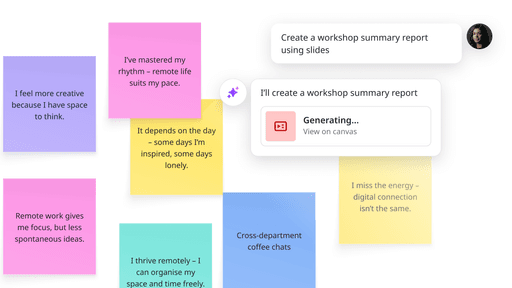 Involucra al público en retros, talleres y formaciones con actividades interactivas, y luego deja que la IA organice los comentarios y los convierta en próximos pasos claros.