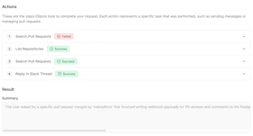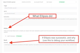 You can view the thoughts and actions that Ellipsis took for any workflow run. Use this to debug and iterate on your instructions when tagging Ellipsis.