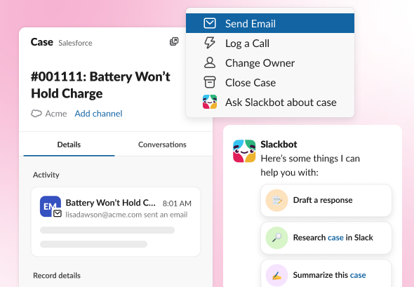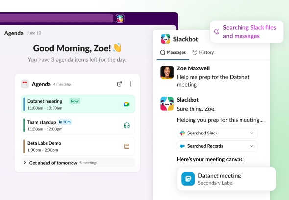 Slackbot 懂你的頻道、對話和客戶,還能根據你的提示立即執行動作。建立新客戶、記錄近期通話要點、更新記錄,所有動作在 Slack 就可完成,你只要交辦就做得到。