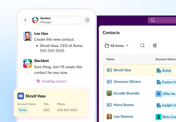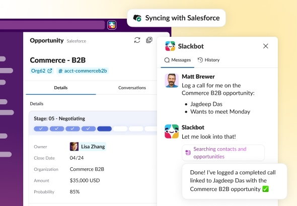 從今日所需開始著手,在 Slack 就可完成。系統會在後台將每一次對話、更新,和每位聯絡人都連線到 Salesforce。當團隊準備好使用完整的 CRM 時,無需任何移轉動作,因為你在 Slack 中擷取過的任何內容早已存在。