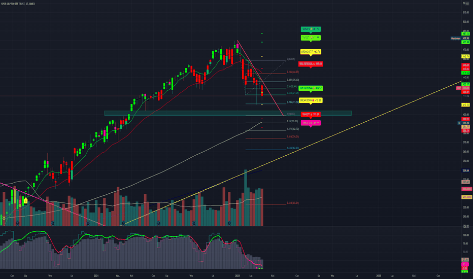 SPY - gdzie skończy się korekta?SPY nie pokazuje jeszcze końca korekty - potencjalnym miejscem trwałego odbicia może być gap na poziomie ok. 400$ - dodatkowo mamy tutaj zasięg 100 fibo rozszerzonego oraz potencjalnie SMA100. Zestaw wskaźników Magic Indicators również nie pokazuje oznak końca korekty.