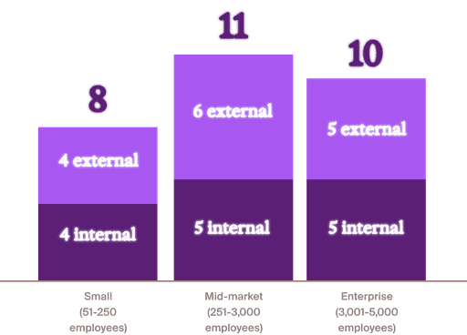 Enterprise companies stabilize around 10, absorbing some of that overhead through dedicated coordination roles and infrastructure mid-market teams are still building.
