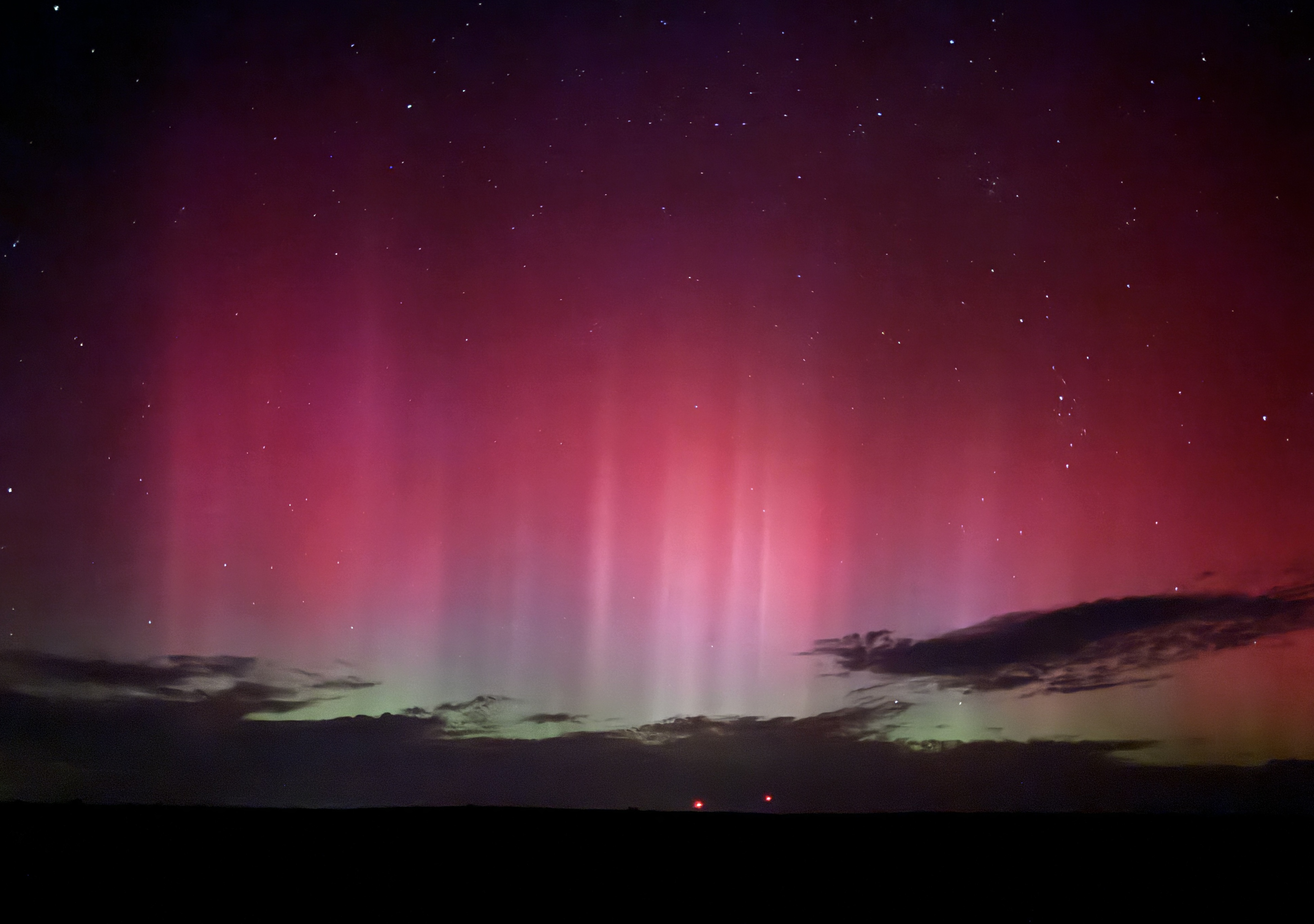 What might look like a pair of spacecraft orbiting a pale green exoplanet (as "Adrian" is described) is actually a photo of the International Space Station above Earth in October 2024. Severe geomagnetic storms created not only the more common shimmering green northern lights, but also very rare bright-red auroras in the atmosphere. Credit: NASA astronaut Don Pettit